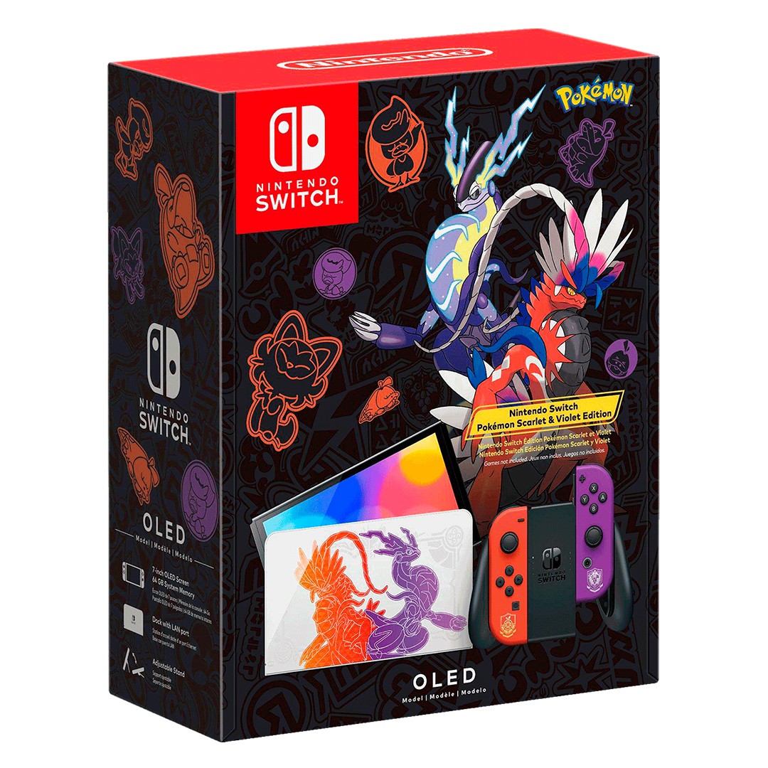 Controles joy-con especialmente projetados. Os controles joy-con incluídos têm as cores principais de pokémon scarlet e pokémon violet e são decorados com os respectivos brasões das escolas dos jogos, Naranja Academy e Uva Academy.