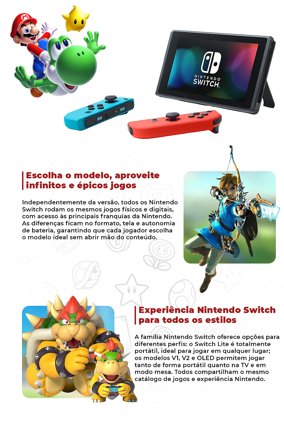 O Switch OLED, lançado em julho de 2021, é uma nova versão do console portátil da Nintendo. Ele entrega melhorias interessantes quando comparado ao modelo padrão, incluindo um display maior, o dobro de armazenamento interno e alguns aprimoramentos em recursos e conectores. A tela OLED, as cores são muito mais definidas, principalmente os pretos e brancos que ficam muito mais nítidos, melhorando os contornos nos jogos e toda a qualidade da imagem. Sua tela touchscreen mede 7 polegadas. Isso representa um aumento com relação ao Switch padrão, que trouxe 6,2 polegadas.