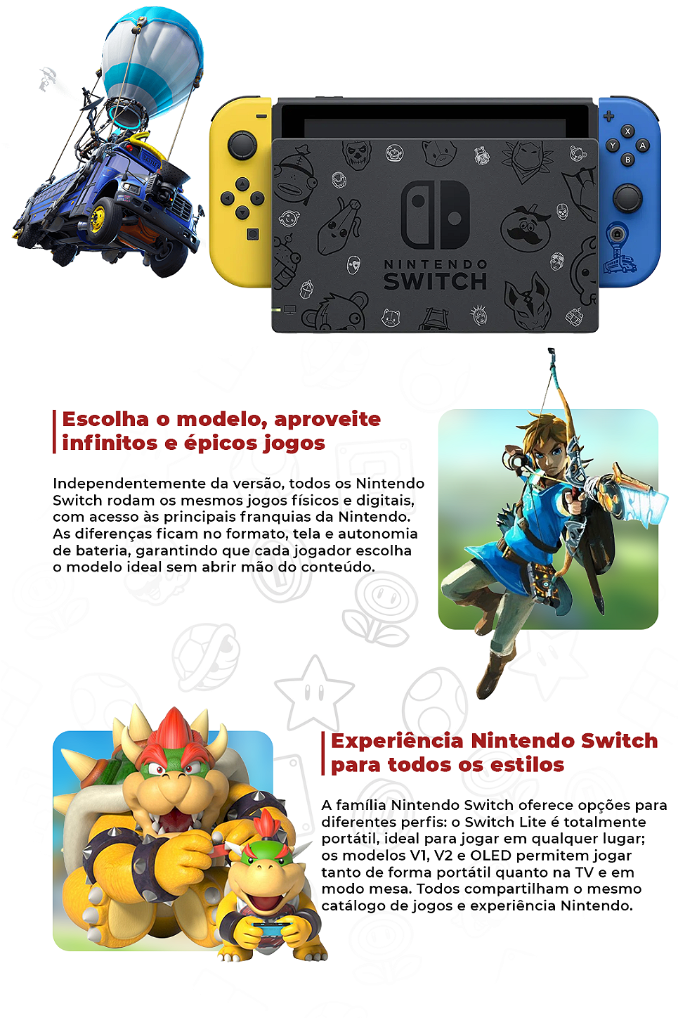 Um dos maiores jogos do mundo se uniu a Nintendo e formou esse console lindíssimo para poder aproveitar e jogar seu Fortnite e qualquer lugar, e além de tudo conseguir se divertir com a família com os exclusivos absurdos de bom da Nintendo, como Super Mario, Super Smash Bros, etc...