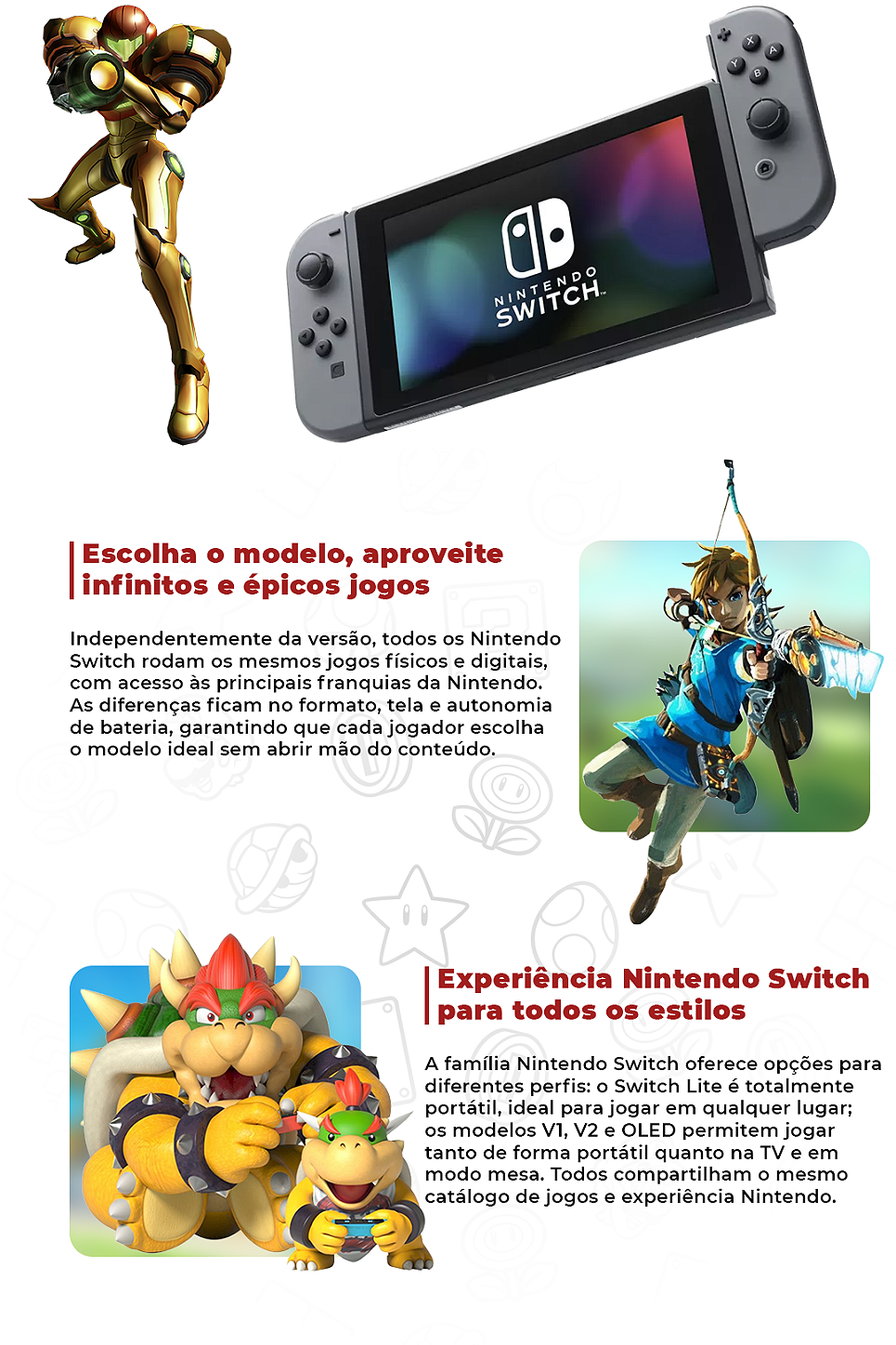 Com o Nintendo Switch, a fabricante de consoles japonesa arriscou em misturar os dois mundos dos games: portáteis e consoles de mesa. Esse é um videogame que funciona tanto em TVs e monitores, quando está conectado em sua Dock de carregamento e quanto longe de cabos, tornando-se um portátil. Além disso, o console possui uma tela LCD sensível ao toque e dois controles que podem ser desconectados, chamados Joy-Cons. Diferente das concorrentes, a Nintendo focou em portabilidade, isto é, caso precise desocupar a TV da sala, é possível continuar o jogo no próprio console.