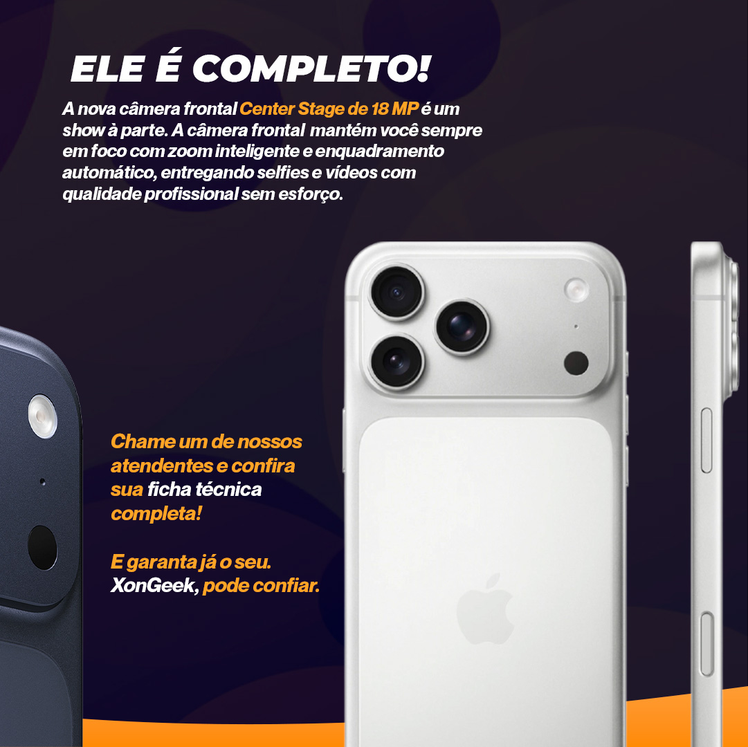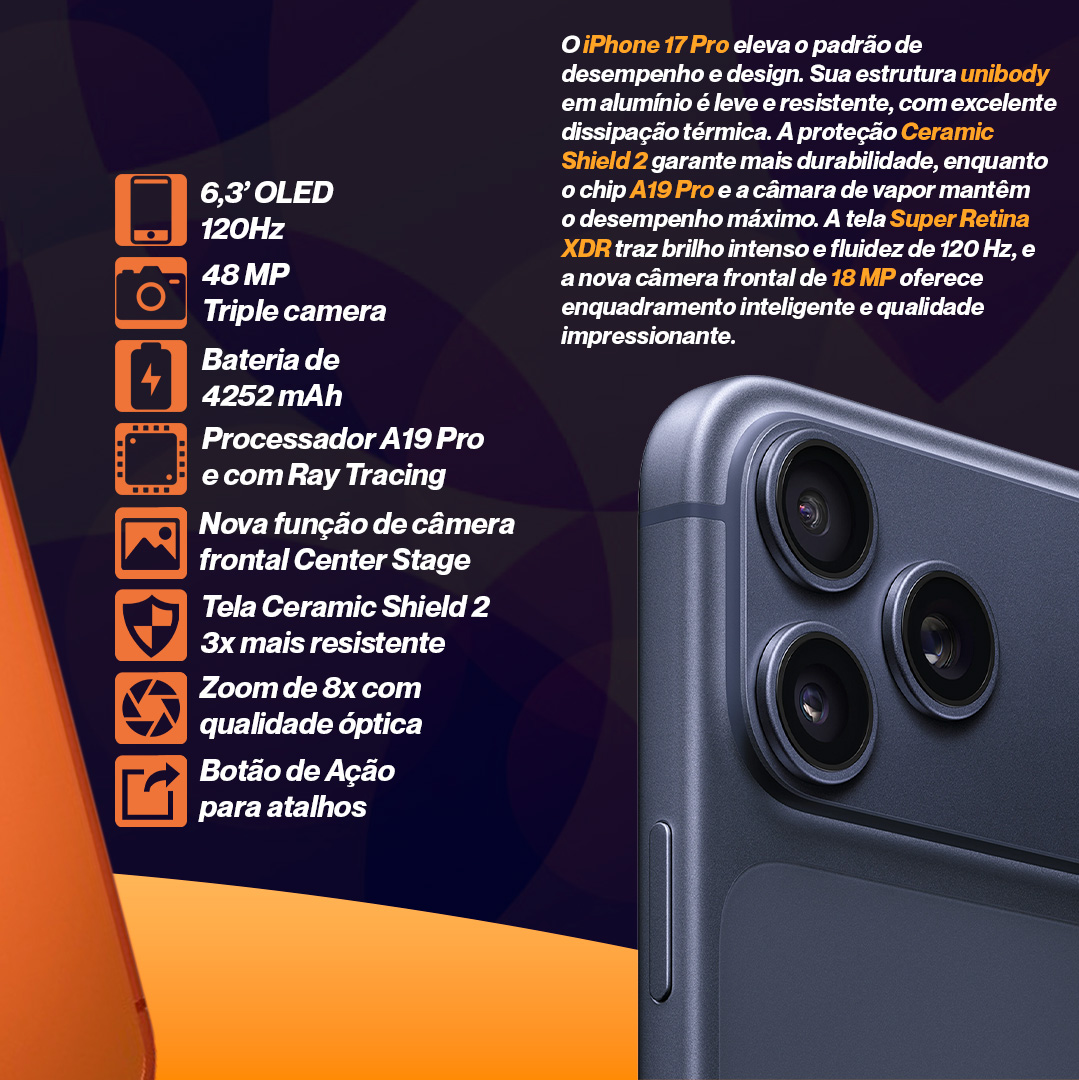 O iPhone 17 Pro combina potência, design refinado e câmeras profissionais. Equipado com o chip Apple A19 Pro de 3 nm, ele oferece desempenho e eficiência energética de última geração. A tela LTPO Super Retina XDR OLED de 6,3” entrega brilho máximo de até 3.000 nits e taxa de atualização de 120 Hz. O sistema de câmeras triplas com sensor LiDAR garante fotos e vídeos em qualidade cinematográfica, com gravação em até 4K 120 fps e suporte a ProRes RAW e Dolby Vision. Com corpo em alumínio, vidro Ceramic Shield 2 e resistência IP68, o iPhone 17 Pro é a escolha ideal para quem busca tecnologia e desempenho de ponta.